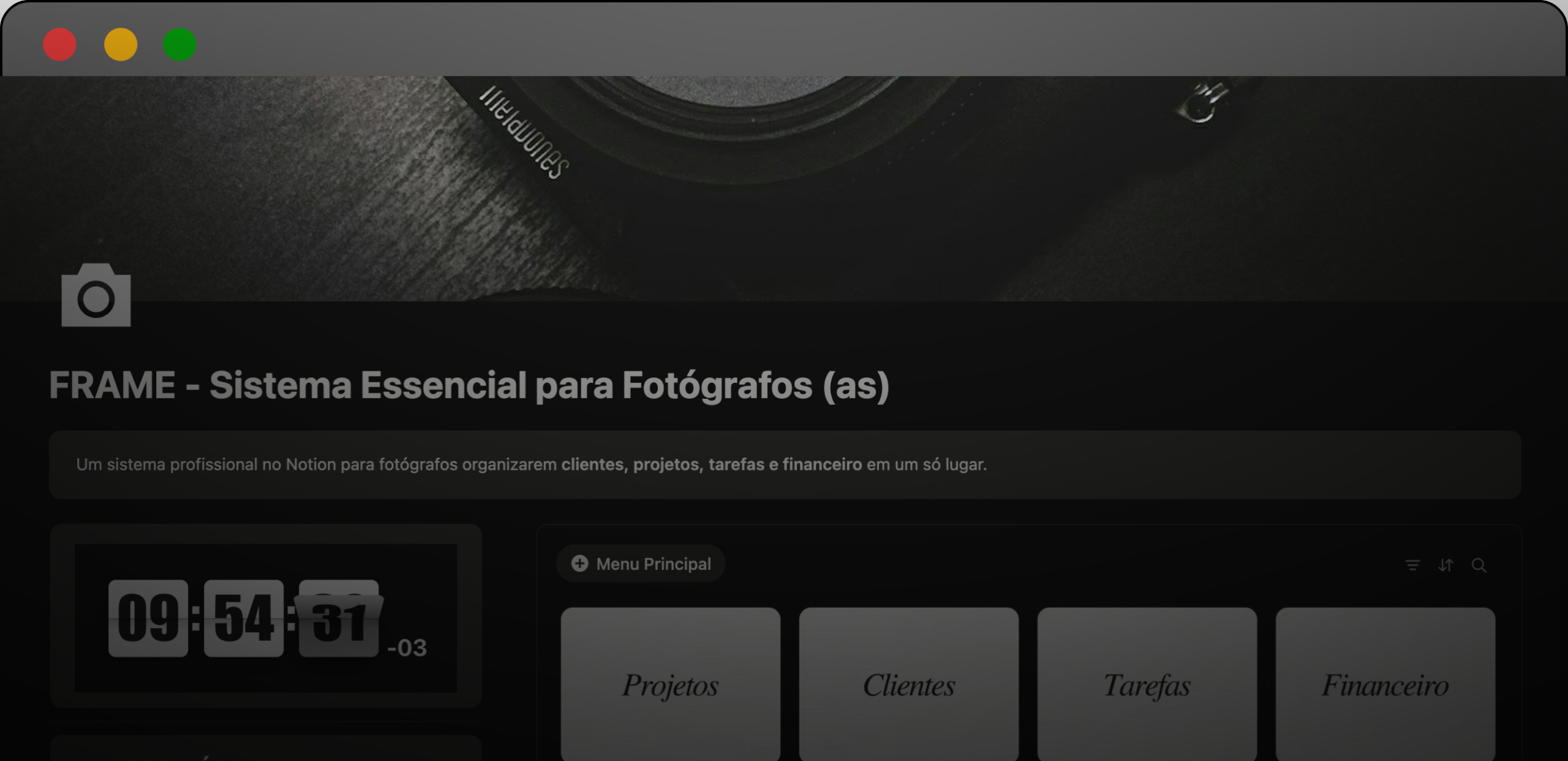 Ele foi criado especificamente para a rotina real de fotógrafos e criadores de conteúdo. Ao contrário de templates genéricos, o Orga entende o fluxo de briefing, produção e entrega desses profissionais.